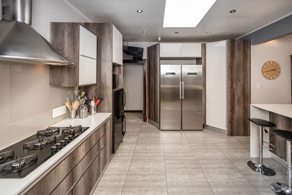 A beautifully appointed lounge with a built-in closed-combustion fireplace flows seamlessly to the open-plan dining room and modern kitchen. The kitchen is spacious and elegant, featuring stylish tiles, Caesarstone countertops, modern fittings and a separate scullery and laundry for added convenience.