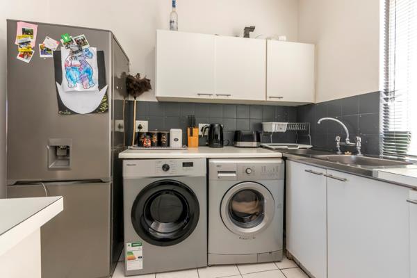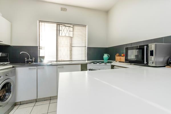 The kitchen has space for 3 appliances, ample cupboard space and a gas stove.