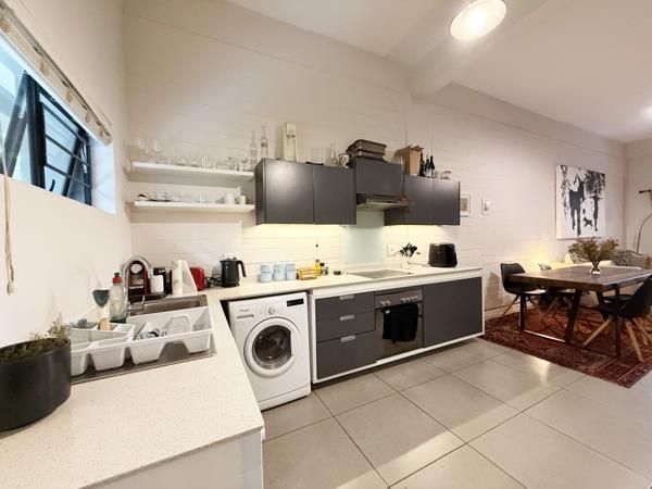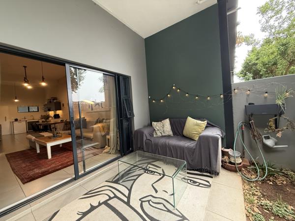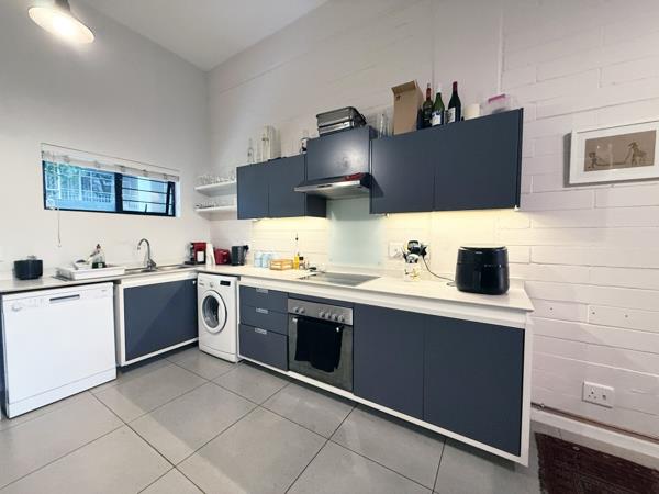 Stylish, north facing ground-floor unit with private garden. Features high ceilings, Art Deco lighting, and a chic grey feature wall.