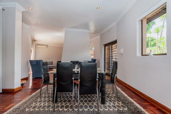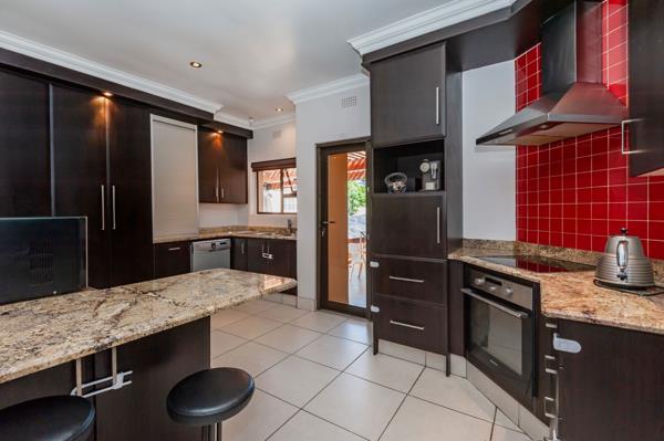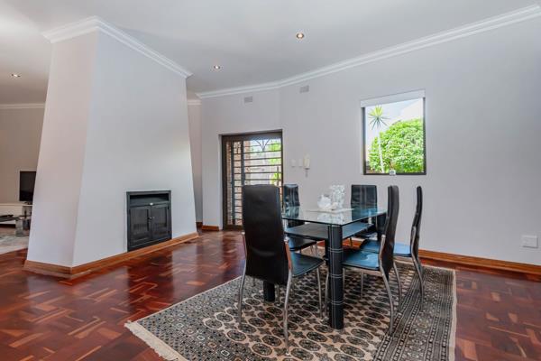 The gourmet kitchen boasts underfloor heating, granite countertops, and space for all appliances ideal for family living and entertaining. The open-plan lounge and dining area offer a cozy double-sided fireplace and air conditioning, ensuring comfort all year round.
