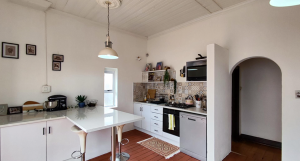 Step inside to discover a home rich in character, boasting 215 sqm of floor space. The modern kitchen is a highlight, equipped with white cabinetry, integrated appliances including an ovenhob and dishwasher, and a stylish patterned backsplash. A functional breakfast bar and terracotta-toned flooring complete this bright space, which benefits from high ceilings and an arched doorway, offering seamless access to an outdoor paved area.