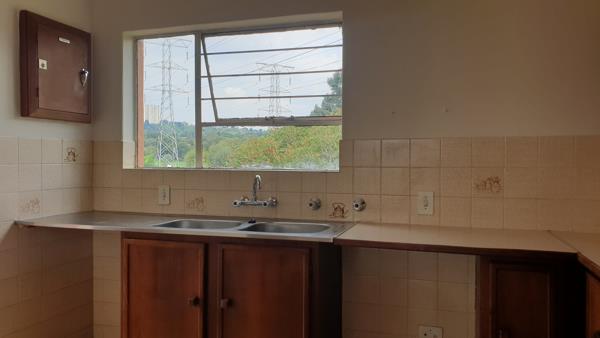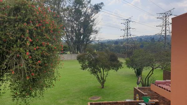 The lounge leads out onto a patio which overlooks green fields and has views of the Northcliff koppies in the distance.