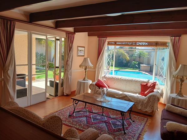 Lounge opening onto a covered patio, overlooking a lush garden and sparkling pool.