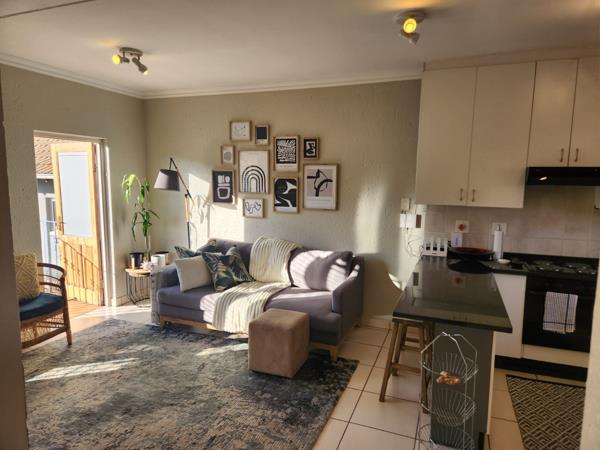 The sunny bedroom boasts generous built-in cupboards, while the neatly designed bathroom offers a shower-over-bath combination for convenience and relaxation.