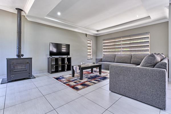Step inside to an open-plan living and dining area, designed for modern family life and entertaining. This spacious zone features contemporary light-colored tiled flooring, ceilings with recessed lighting, and a Beckers heater, creating a warm and inviting atmosphere in winter. The kitchen, seamlessly integrated into the living space, offers wooden cabinetry, dark countertops, and tiled walls, providing a practical and well-appointed area for culinary pursuits. A dedicated family TV room adds further versatility.