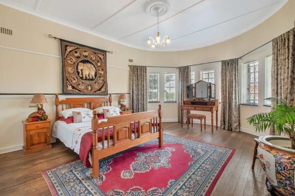 The formal lounge, with original Oregon-pine floors and cottage-pane doors, leads to a dining room adorned with a Gothic-style circular window. The cottage-style kitchen, featuring cherry wood cupboards and granite countertops, overlooks a serene parterre garden. The spacious main bedroom boasts a full en-suite bathroom. Two additional bedrooms share a well-appointed bathroom, while the fourth includes its own en-suite, ideal for guests.