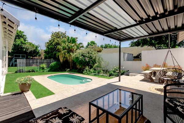 The covered entertainment area is ideal for relaxing with friends and family while the kids enjoy the pool.