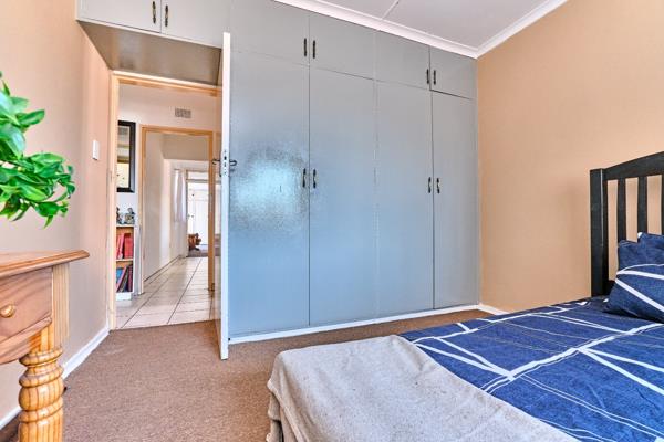 The kitchen with pantry flows into the living area, creating a warm, inviting space. The main bedroom is exceptionally large, while the second bedroom offers ample built-in cupboards.