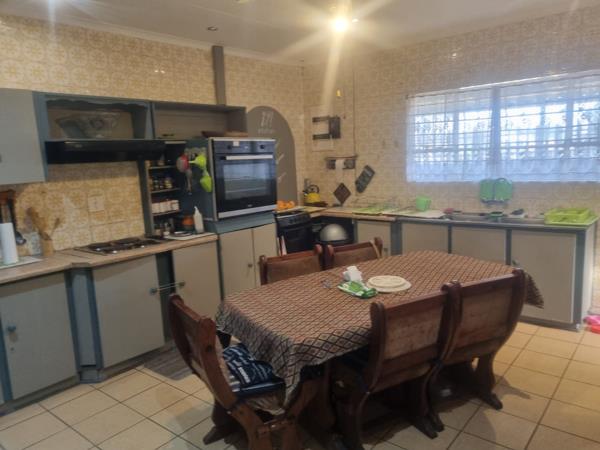 Open-plan kitchen with lots of cupboards and space for a large dining table