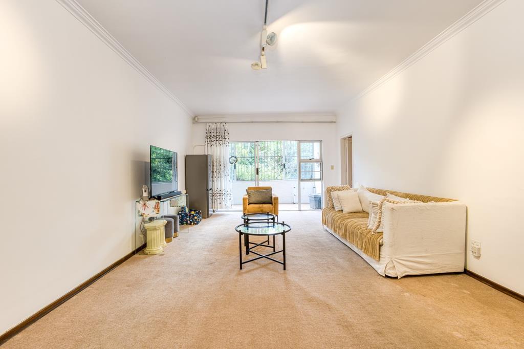 The kitchen is open-plan to the dining area, lounge and living area, glass sliding door leading to an enclosed balcony with views of the communal garden.