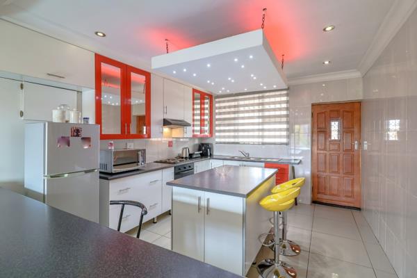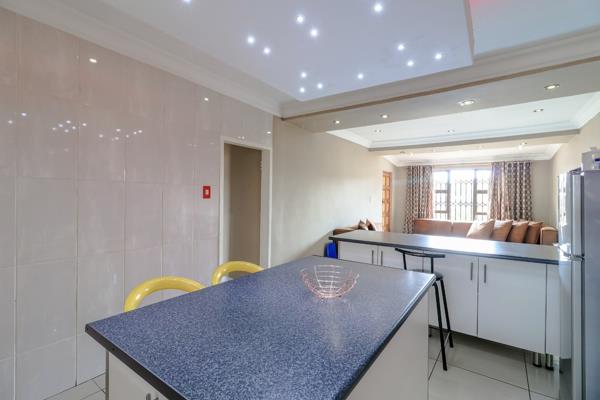 Discover this inviting 4-bedroom, 1-bathroom residence located in Westbury, Johannesburg. This home offers a contemporary open-plan layout, seamlessly connecting the living area with a modern kitchen. The kitchen is a highlight, featuring sleek white cabinetry complemented by dark countertops, an integrated oven and hob, and a practical breakfast bar. Recessed lighting throughout the main living spaces enhances the bright and airy atmosphere, while stylish red accents in the kitchen add a touch of modern flair.