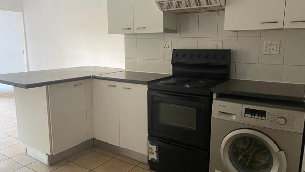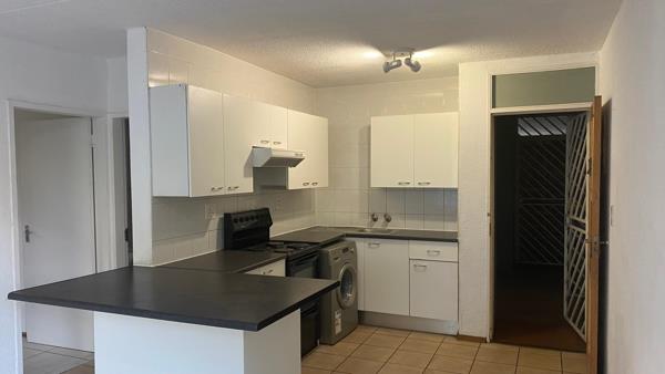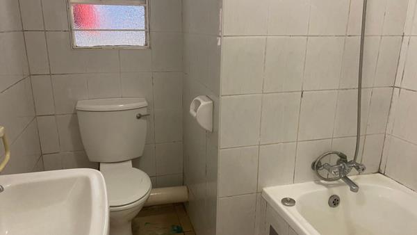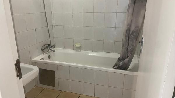 The unit offers two bedrooms, both featuring built-in cupboards and large windows with burglar bars that invite natural light while ensuring peace of mind. The bathroom is neat and functional, offering a bathtub with overhead shower, toilet, and handbasin.