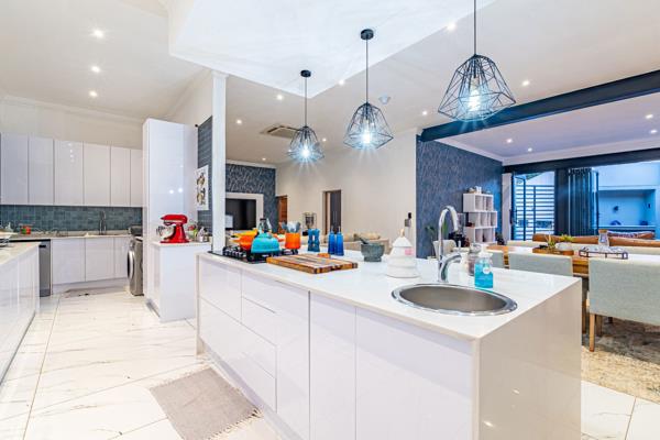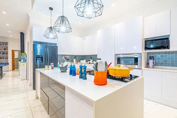 The open-plan living room is the heart of the home, complete with a fitted bar, wood-burning fireplace, air conditioning, and stacking doors that extend the space to the patio. A separate entertainment room offers versatility for a games area, media lounge, or social gatherings, also enhanced with a built-in bar. The modern kitchen is both functional and elegant, showcasing modern design through marble floors, Caesarstone countertops, a central island, pantry, and high-end appliances including an eye-level oven, gas/electric stove, and dishwasher connection. Sliding doors enhance the space through natural lighting, and create effortless flow for indoor-outdoor entertaining. Each of the four bedrooms is well-appointed with built-in cupboards and plush carpeted flooring. Two bedrooms include air conditioning and sliding doors opening to the outdoors, creating light-filled retreats that merge seamlessly with the garden. The exterior is designed for leisure, with a covered and enclosed patio, built-in braai, and expansive garden.