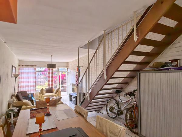 The open-plan lounge and dining area are tiled, with the lounge opening onto a patio and garden for seamless indoor-outdoor living. The tiled kitchen provides ample cupboard and counter space, along with plumbing for a washing machine. Upstairs are two well-sized bedrooms with parquet floors and built-in cupboards, plus a bathroom with shower and a separate toilet.