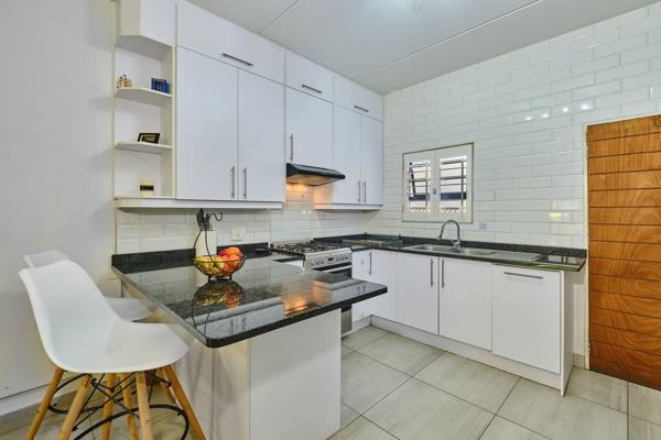 The heart of the home is a bright and airy open-plan lounge and kitchen. The modern kitchen is fitted with sleek white cabinetry, dark granite countertops, a built-in oven, gas stove, and a practical breakfast bar, making everyday living both functional and stylish. Light-coloured tiles and abundant natural light enhance the fresh, welcoming feel.