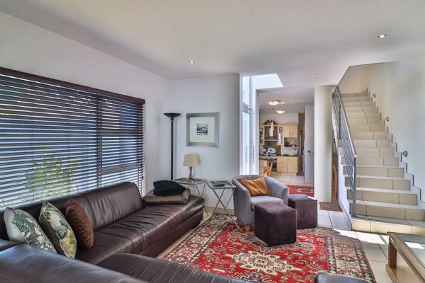 Lovely open-plan lounge/dining room, with a gas fireplace, leading onto the covered patio with a built-in braai overlooking the pool and secluded garden.