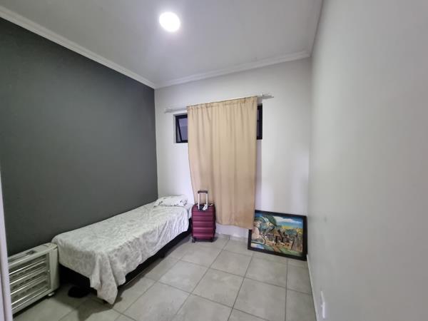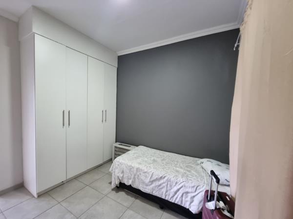 The second bedroom can fit a single or three-quarter bed and includes a fitted desk, making it ideal for use as a home office.