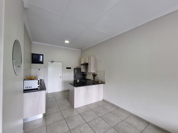 The kitchen offers ample cupboard and counter space, a sink, an electric oven, a hob and extractor fan, plus room for a single-door fridge and one water appliance. The spacious living area leads out to a balcony with a view.