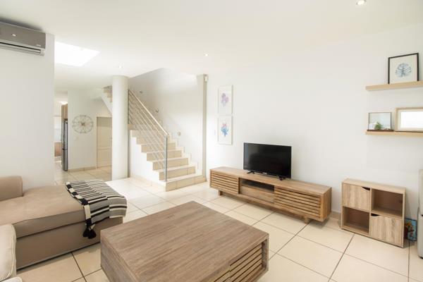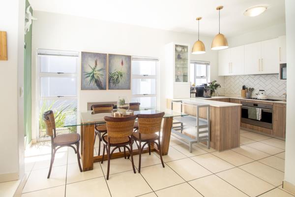 Lovely open-plan lounge/dining room with a gas fireplace leading onto a covered patio with a built-in braai, overlooking the pool and secluded garden.