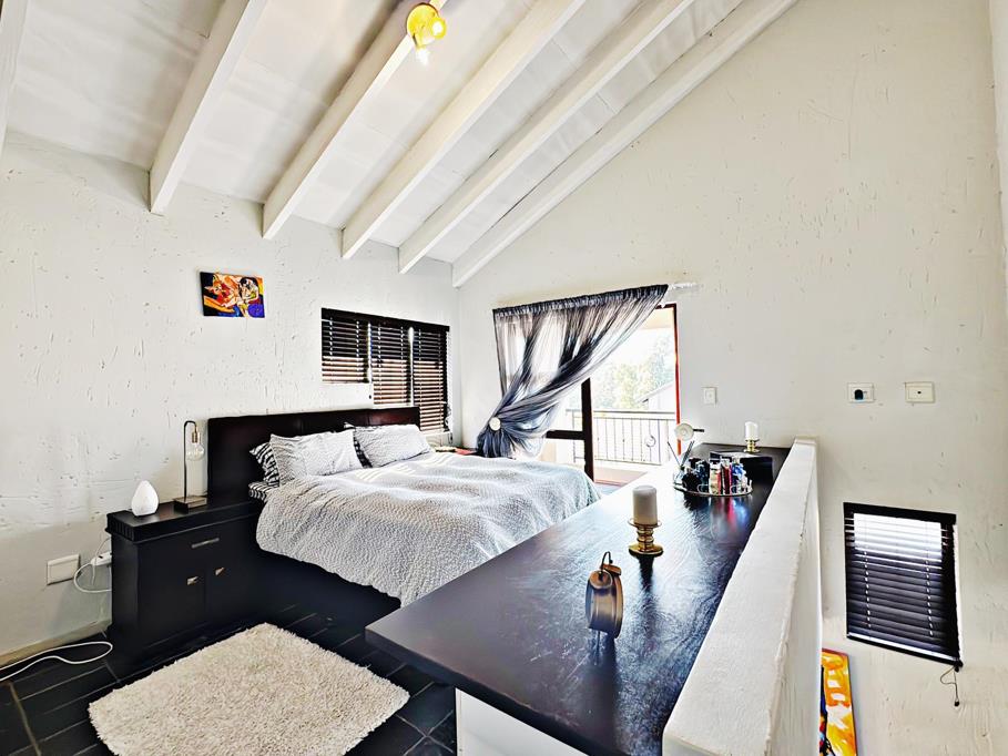 There are 2 bedrooms. The first bedroom is located on the bottom floor with extra cupboard space in form of a linen cupboard and a normal built-in cupboard. Storage is not a worry but a pleasure! The first bathroom is conveniently placed and has a large shower, well-sized bath, toilet and basin. Modern and sleek!