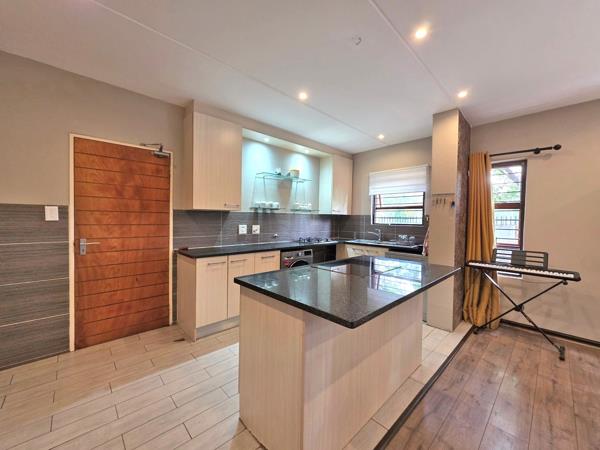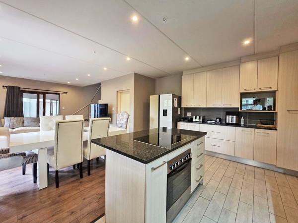 For added convenience, there is a guest toilet under the staircase. The lounge opens onto an enclosed patio with a built-in braai. Private, beautiful garden, ideal for lazy Sundowners in summer.