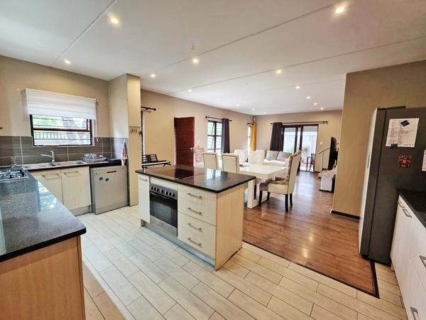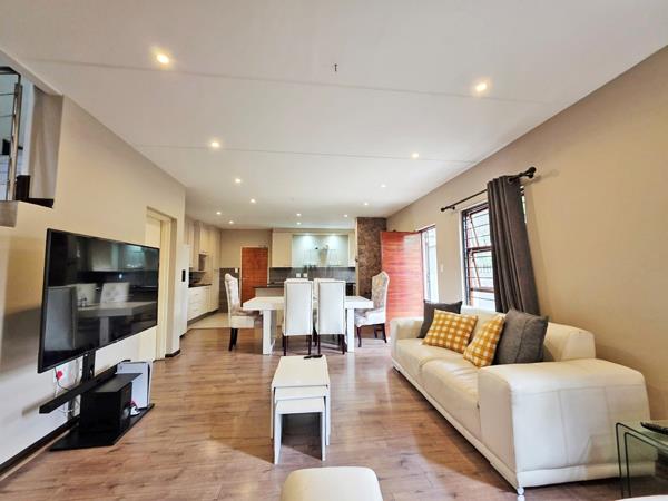 The open-plan lounge and dining area is spacious and fitted with laminated flooring throughout, creating a warm and welcoming flow.
