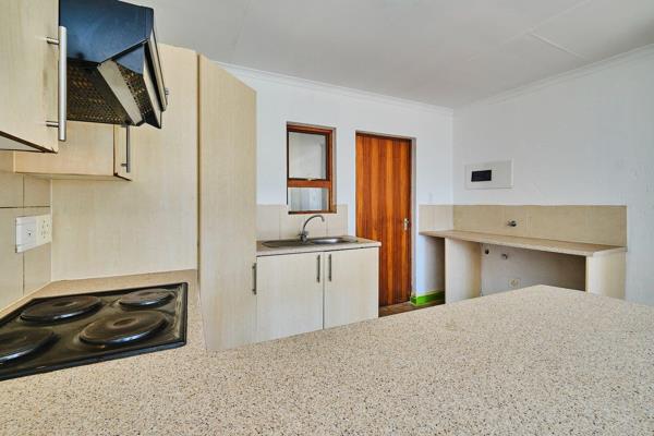 The well-appointed kitchen boasts an electric stove and oven, ample built-in cupboards, and dedicated space for a water applianceperfectly blending functionality with style.