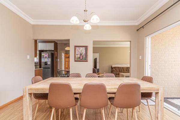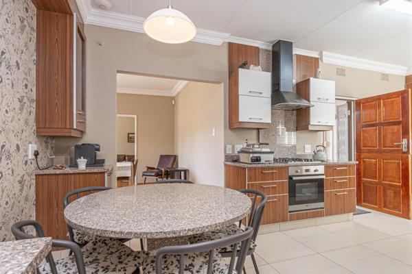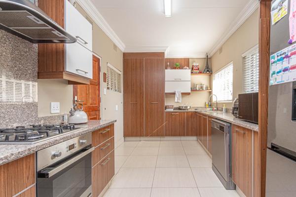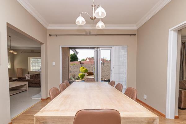 The spacious lounge features a cozy fireplace for winter evenings, tiled floors, blinds, and curtains, and opens onto an entertainers patio through stacking doors. The TV lounge also has blinds and curtains with stacking doors that lead directly to the garden. An elegant dining room, ideal for an 8-seater table, flows onto the patio with stacking doors, making this a true entertainers home.