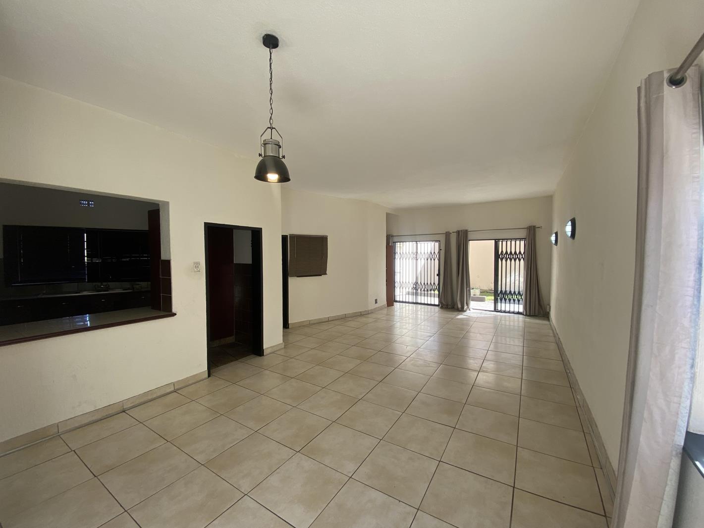 Spacious, tiled, open-plan loungedining room leading out onto covered patio with private, pet-friendly garden.