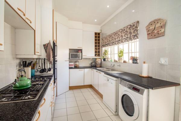 Kitchen tiled with space for 2 wet appliances , Granite counter tops, Gas hob and double eye level ovens, Built in cupboards, lead to back courtyard.