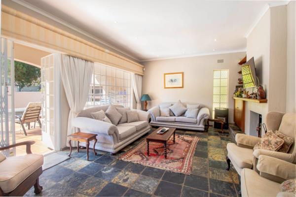 Lounge slate tiled floors with french doors leading to covered patio. Fireplace