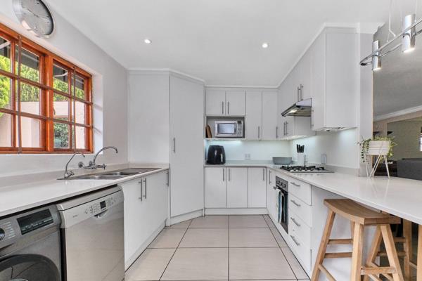 There is a dedicated wash-up area space for 2 wet appliances & corner grocery cupboards. The counter tops finished in white Caesar stone add class & style, with 4x gas plate burner and under counter oven with stainless-steel extractor fan. Access through a wood & glass door to the back enclosed courtyard lead to double garage, dustbins & wash line area.