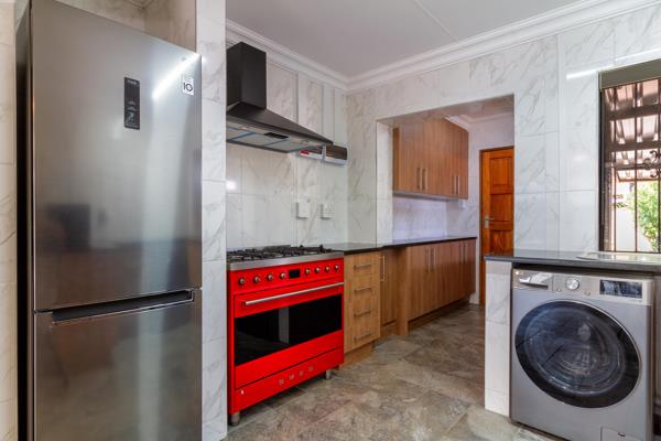 The functional and clean design of the kitchen is complimented with a beautiful six-plate Smeg gas stove and space for two undercounter appliances.