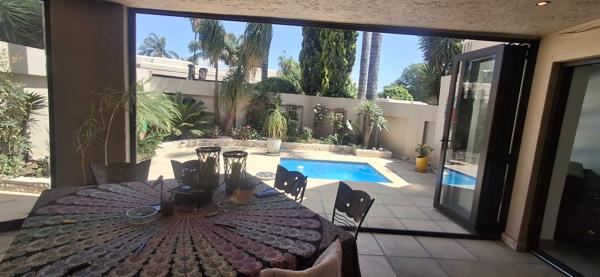A built-in bar opens to an enclosed patio with a built-in braai, perfect for hosting. The folding doors open to a tranquil garden with a splash pool, creating a seamless indoor-outdoor experience.
