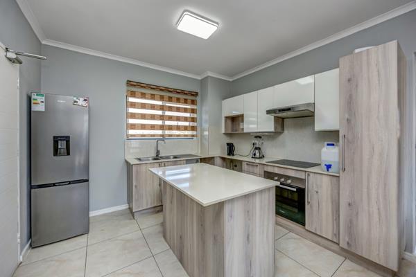 Open-plan modern kitchen with Caesarstone countertops, centre island, ample cupboards and space for 2 wet appliances and a single-door fridge
