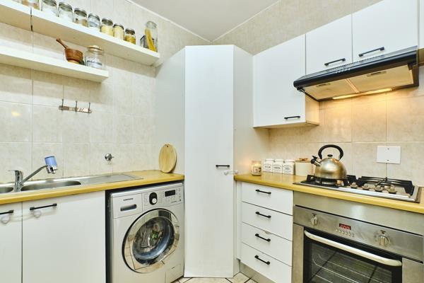 Upon entering, you are greeted by a compact yet well-designed kitchen with ample space for a washing machine, tumble dryer, and dishwasher. The kitchen is fitted with melamine countertops, a gas hob, an electric oven with extractor fan, a pantry, and plenty of built-in cupboards and shelving.