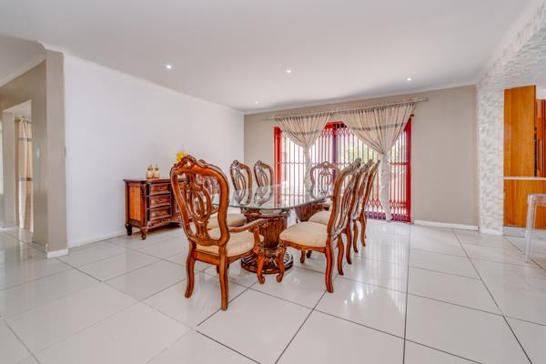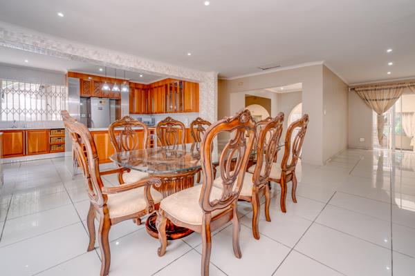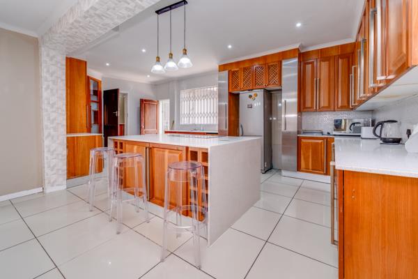 Main kitchen features tiled flooring, Caesarstone countertops, electric stovetop, two eye-level electric ovens, plenty built-in cupboards, a large center island, prep bowl, prep sink, large corner pantry, space for a double fridge, and access to the courtyard open plan to the tiled dining area which features a security gate, trellis door, and sliding door leading to the front yard