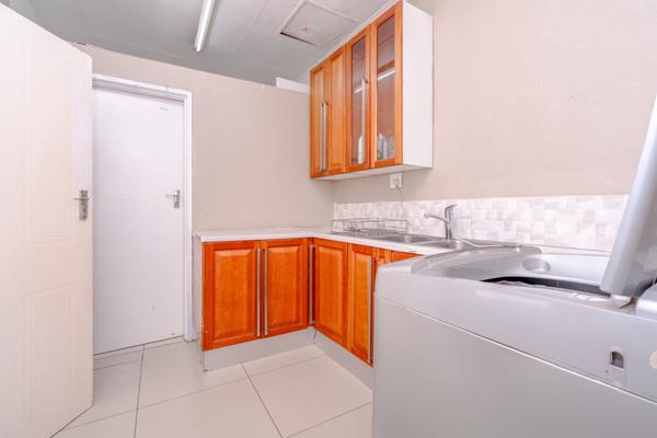 Scullery of the main house features tiled flooring, melamine countertops, built-in cupboards, space for one appliance, and a double sink
