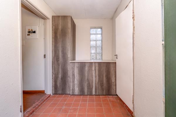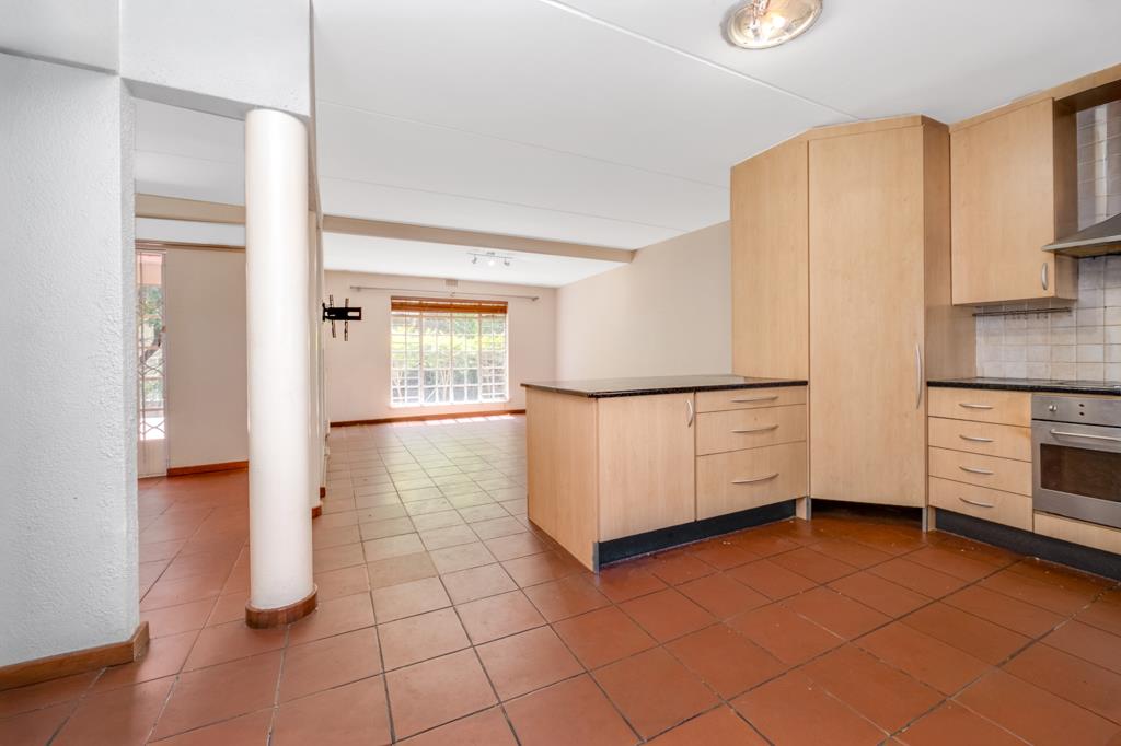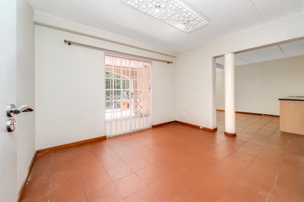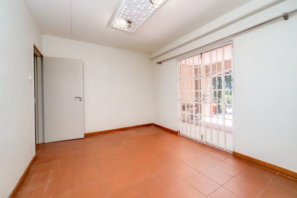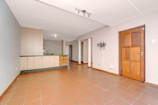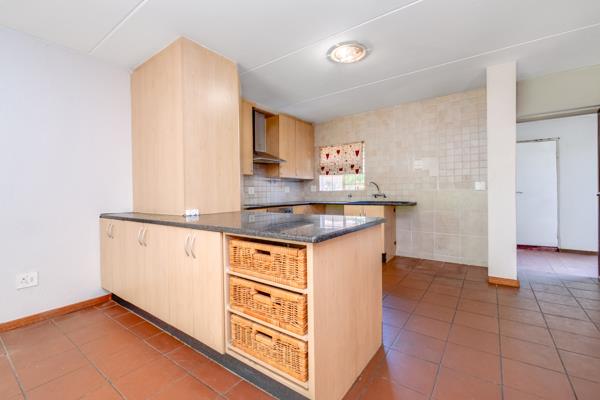 Open-plan lounge area sharing a breakfast nook and additional cupboard space with the kitchen includes a large north-facing window with burglar bars and an east-facing door leading to the covered patio