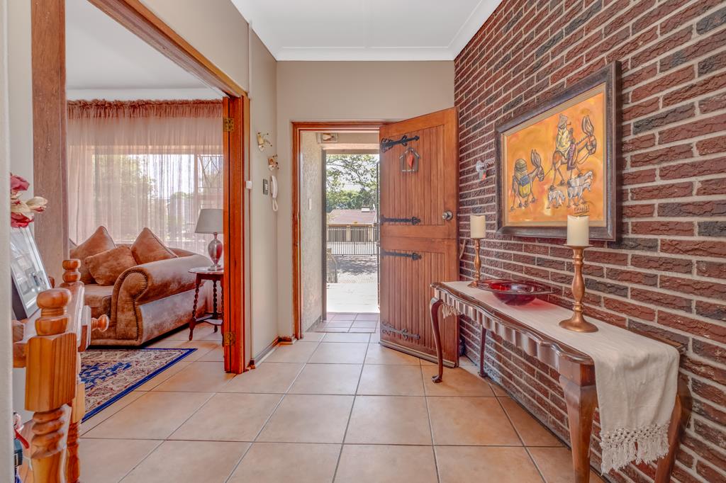 The TV room features tiled flooring, a spacious layout with direct access to the kitchen, and doors leading out to the back garden and pool area.