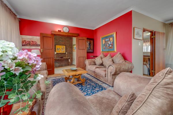 The first bedroom features laminated flooring, built-in cupboards and shelving, a ceiling fan, a large window overlooking the garden, and a connecting door to the TV room.