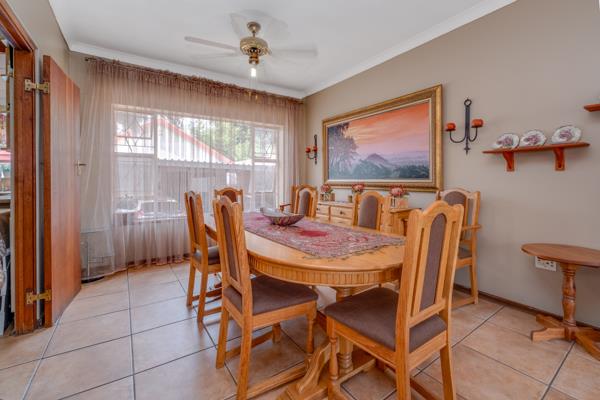 The dining area features tiled flooring, a large south-facing window, and a ceiling fan.