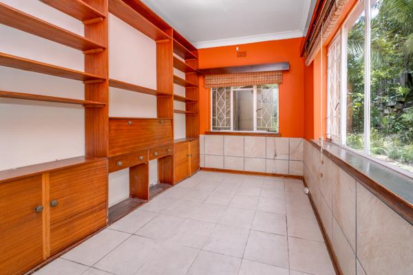 Separate Home Office: Dedicated space with tiled flooring, shelving for books and files, and two large bright windows ideal for productive work-from-home days.