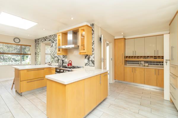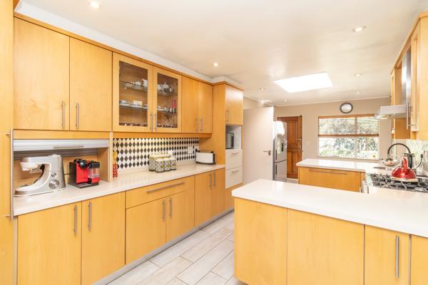 Stylish, spacious, state-of-the-art kitchen fitted with beautiful, white Caesarstone counter tops. Gas stove, pantry cupboard, space for 2 appliances and a double-door fridge. Large dining room leads off from kitchen with stacking doors leading out onto patio.