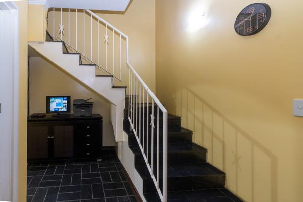 The layout includes three bedrooms and two bathrooms upstairs (the main bedroom is en-suite), and an additional bedroom and guest toilet downstairs. The unit features a fully fitted modern kitchen and the generous lounge opens onto a beautifully lawned, fully walled private garden. There is also a lovely balcony that runs the length of the upstairs. Security is comprehensive, with beams, cameras, and full burglar proofing.