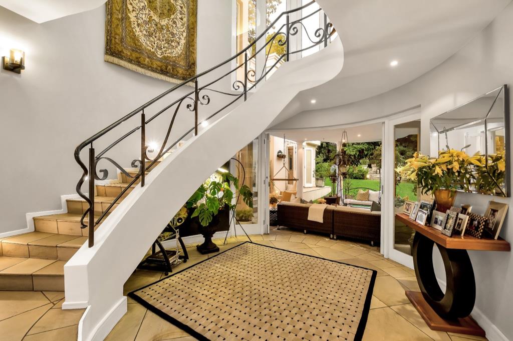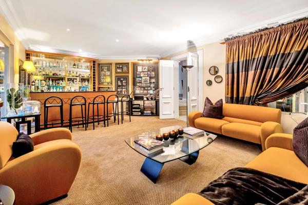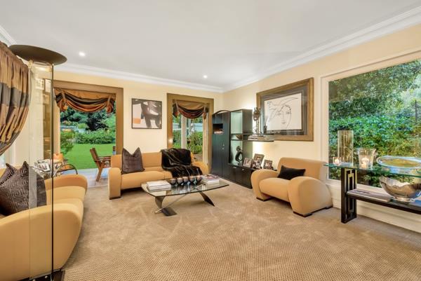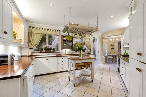 Elegant covered entrance into a tiled double volume entrance hall with views through the stacking sliding doors to the patio and garden. Wonderful entertainers sitting room, carpeted, fitted bar and doors leading onto the patio. The elegant dining room, carpeted and doors to the patio. Beautiful sunny kitchen is open plan to a breakfast area and the family room. The kitchen has wooden counters and a gas/electric oven, the breakfast room opens onto the patio and through to a north facing bright family room.