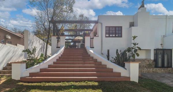 An expansive entertainer''s patio with a built-in braai extends from the dining room and kitchen.