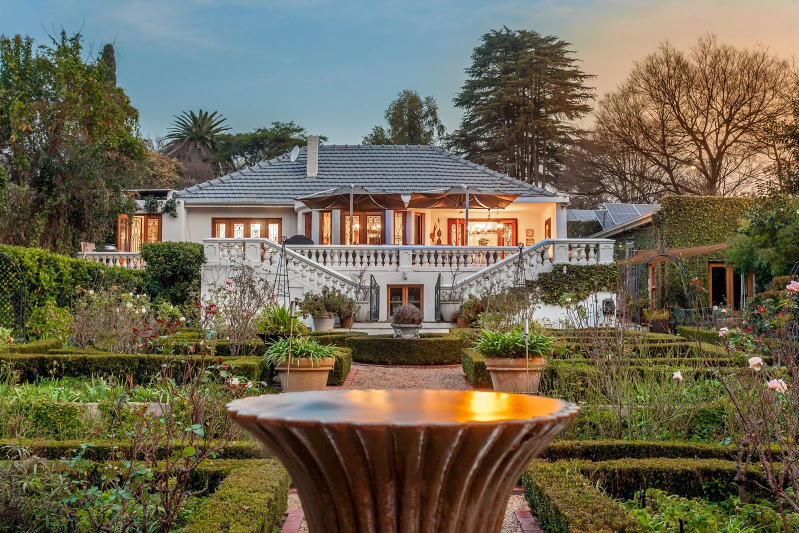 A romantic retreat calling young lovers and empty nesters. . The art dealer owner has created a charming mix of old and new, a bygone era blended effectively with striking modern forms. The cherry on top are the formal landscaped gardens, surrounded by tall trees, country charm, fountains, manicured hedges and summer roses culminating in an evergreen glade with a meandering stream. Wooden floors, sash windows, French doors, stained-glass windows and attractive wrought-iron work. Large sunny patio with Italian renaissance-style pillars and balustrades with sweeping staircases.