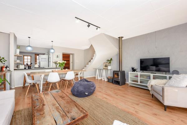 The ground floor of the duplex features an inviting open-plan kitchen with a gas hob, seamlessly flowing into the dining and living area complete with wood burning fireplace. Sliding aluminium doors open out to a serene patio and meticulously manicured private walled garden. The lower level includes a guest cloakroom and an outdoor laundry and drying yard.