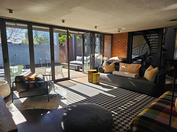 Ideal for professional couples, a perfect lock and go.. A striking structure in concrete and steel, this one of a kind home, situated on a quiet secluded pan-handle in Craighall, ensuring ultimate privacy, is an architectural sculpture in glass and stone. Facing north with vast expanses retracting to create living spaces which merge with patios and gardens. Created by the present owner with care and pride, attention to detail and no expense spared. Mezzanine levels house sleeping areas linked by double volumes. Natural materials, shuttered concrete, hard woods, exposed brick walls, galvanised steel, industrial sized glass panes combine into a sophisticated dwelling for executive singles and couples who demand the best.